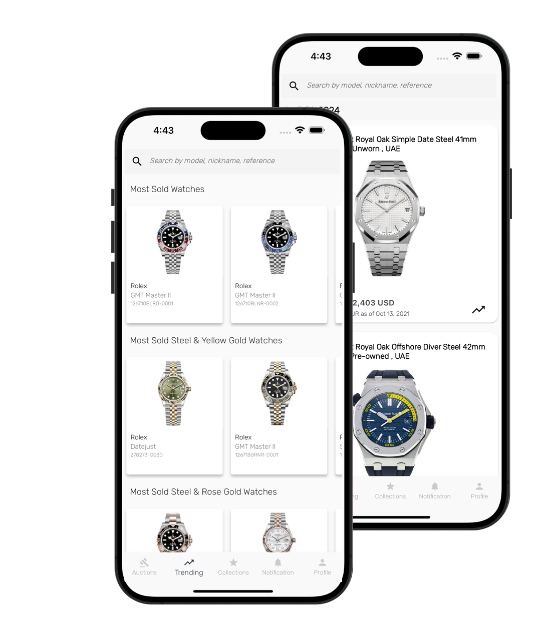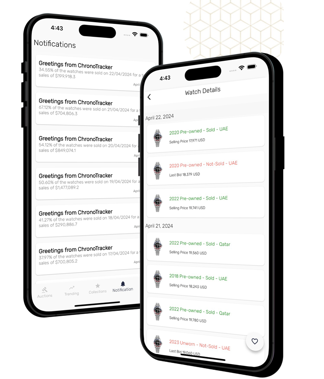 At ChronoTracker, our mission is to provide reliable data and insights about daily watch auctions in the GCC (Gulf Cooperation Council) region. Our user-friendly mobile app lets watch enthusiasts monitor over 1,000 luxury watches each week with ease. We aim to offer a seamless experience as you explore the secondary market prices of luxury watches in the GCC which in turn reflect the global market one's.